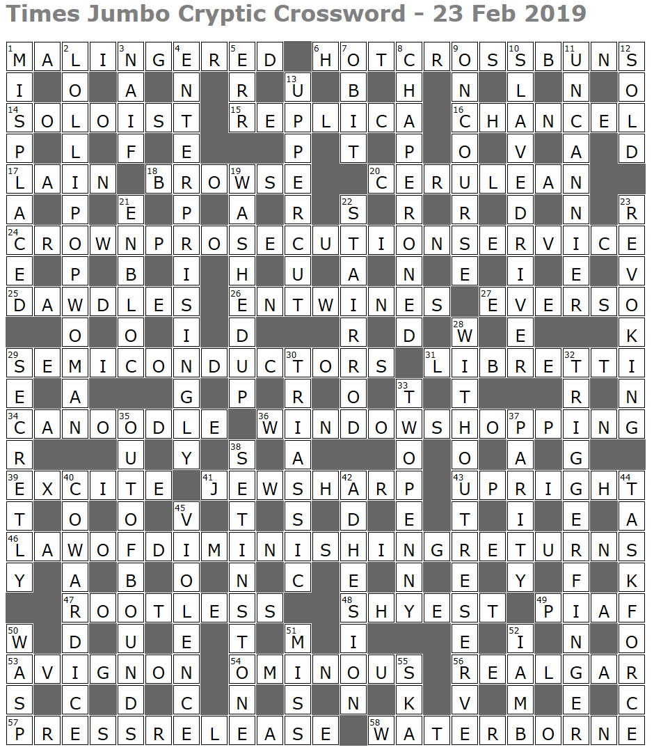 Another Saturday, another Times Jumbo Cryptic Crossword! I liked this one, with only one clue jiggering me. You’ll find my completed grid below, along with explanations of my solutions where I have them.