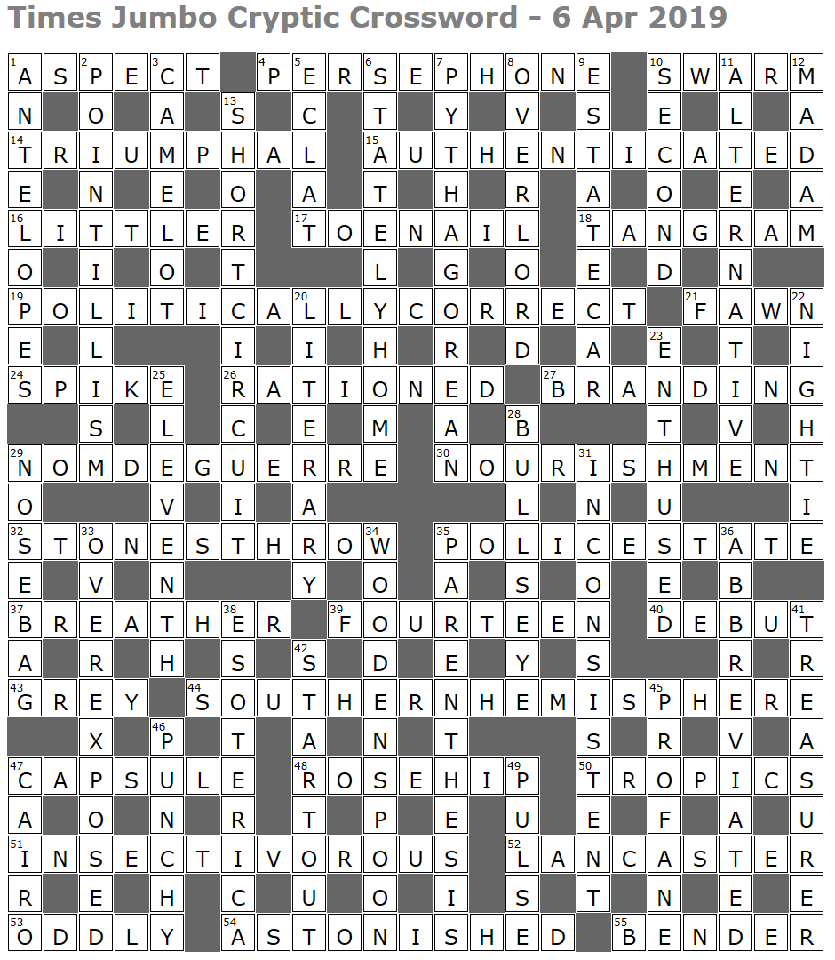 Another easy puzzle this week, but also another with several clues I rather liked for their clever construction or how well they scanned. The only blot here is the re-emergence of several solutions from recent puzzles, including one that was essentially a direct copy. I know The Times uses software to generate certain puzzles (which, weirdly, is why you’ll find the word “moist” appearing an uncomfortable number of times in the top-right corner of their Codeword puzzles), but I keep alive the hope they aren’t doing the same here. Still, it makes you wonder. Anyway, wanging aside, you’ll find my completed solution below, along with explanations of my solutions where I have them.