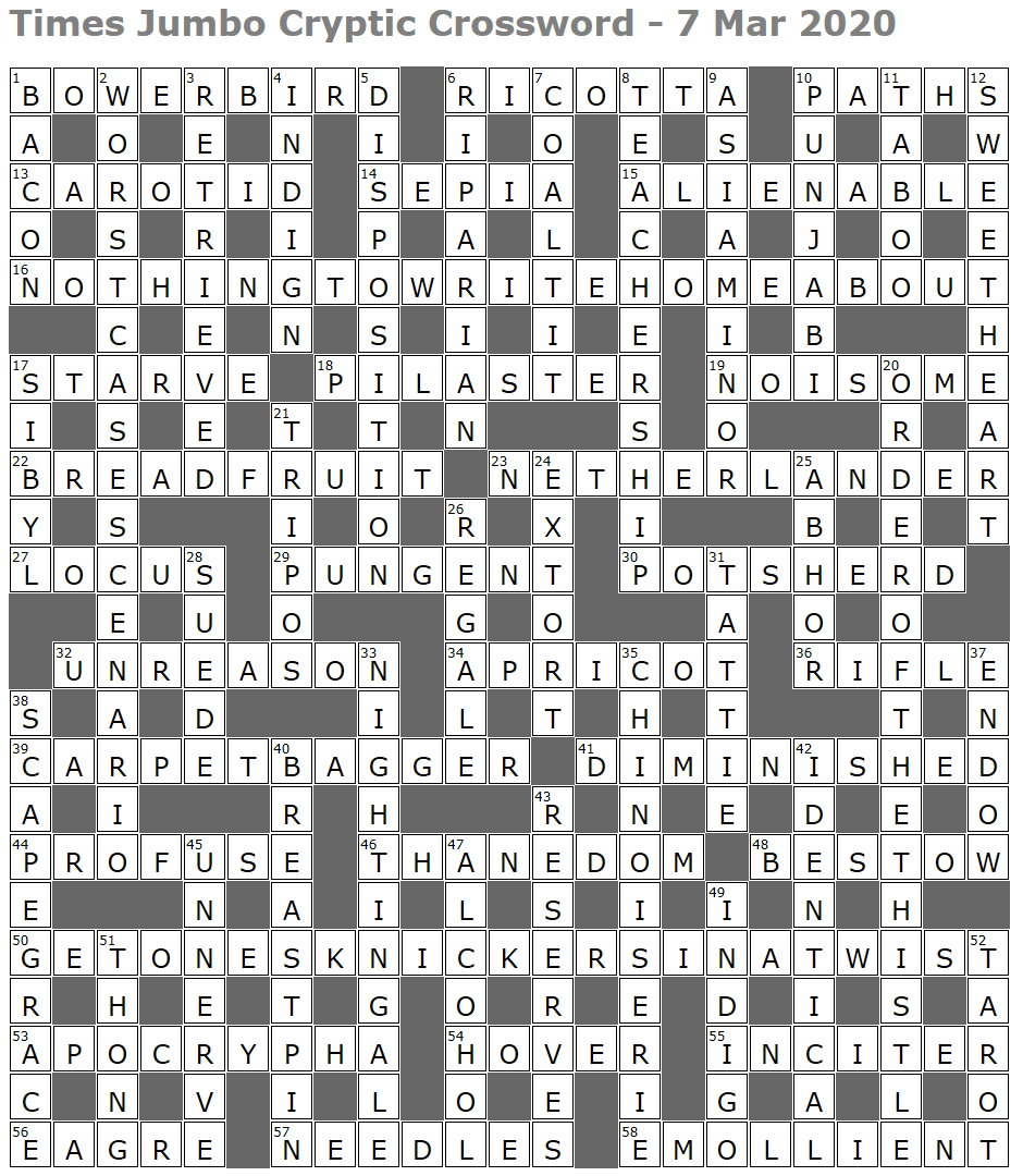 You can find my completed grid below along with explanations of my solutions where I have them. If you’ve got previous Jumbos that have given you grief, then my Just For Fun page might help you. I’ve got some other odds and ends knocking around, so it’s not all crosswords, crosswords, crosswords. If book reviews are your thing, then I’ve got a few over thisaway. If you’d like a story of mine to get you through a spare half hour, then head over thataway.
