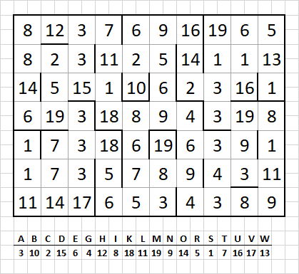 The idea of this puzzle was to determine the values, 1-19, of the letters used in 39 algebraic equations forming the across and down clues. We are told that three of the solutions are palindromes, 8d, 24d and 29d. The solutions were then to be slotted into the grid with each cell containing one or two digits. The values in each cell were then to be replaced by their equivalent letters.