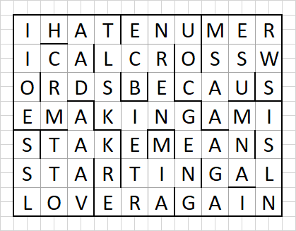 Now that the deadline has passed for submissions, I thought as a one-off post I’d stick the solution on here, purely because the message in the grid made me laugh.