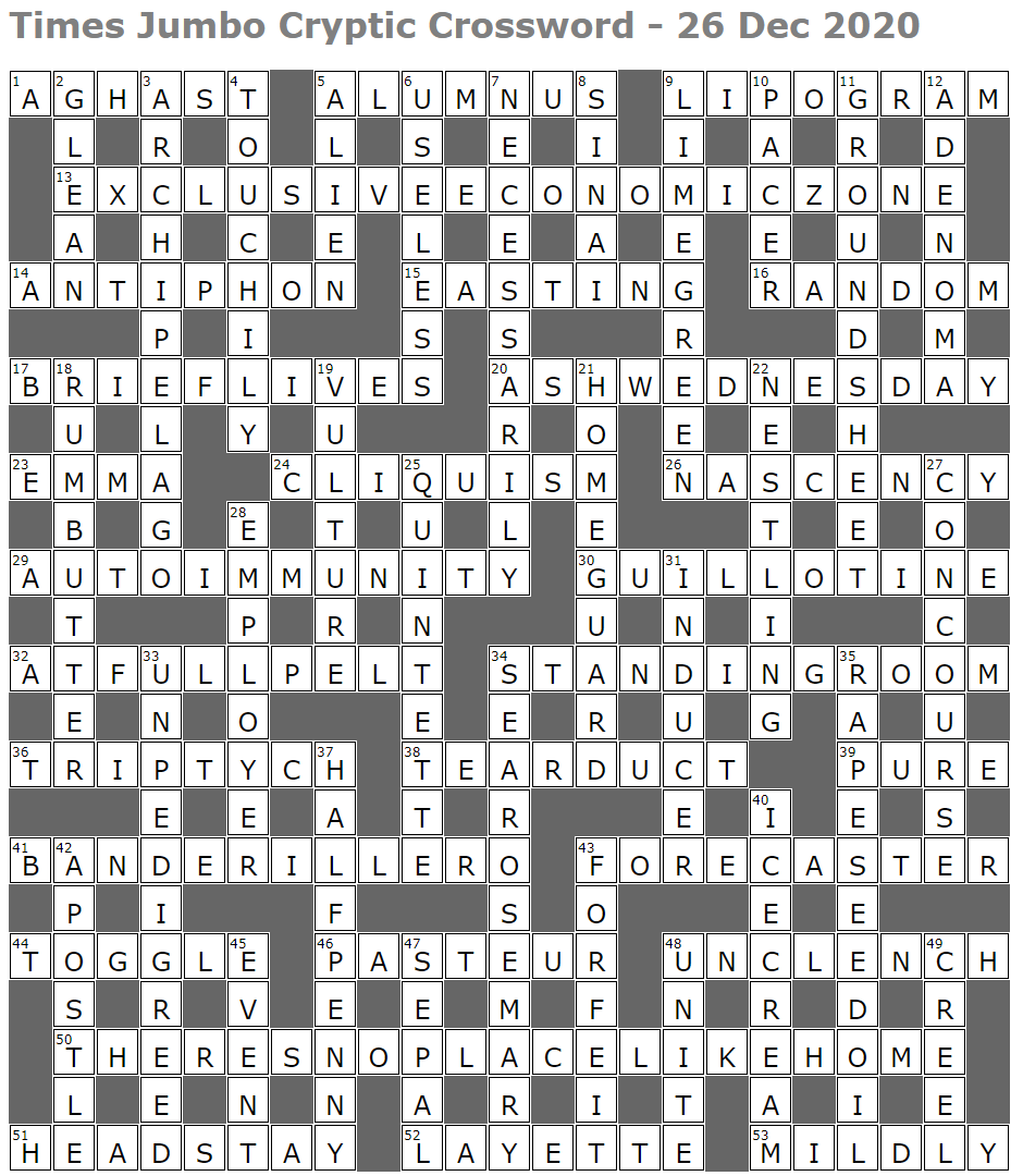 A medium strength effort for Boxing Day, but not one that will live long in the memory. There were some good clues to be had, but as a whole it didn’t really spark with me. Shame too that the Times seems to have missed the Jumbo Cryptic’s 50th birthday. Maybe they’ll do something for the Bank Holiday special.