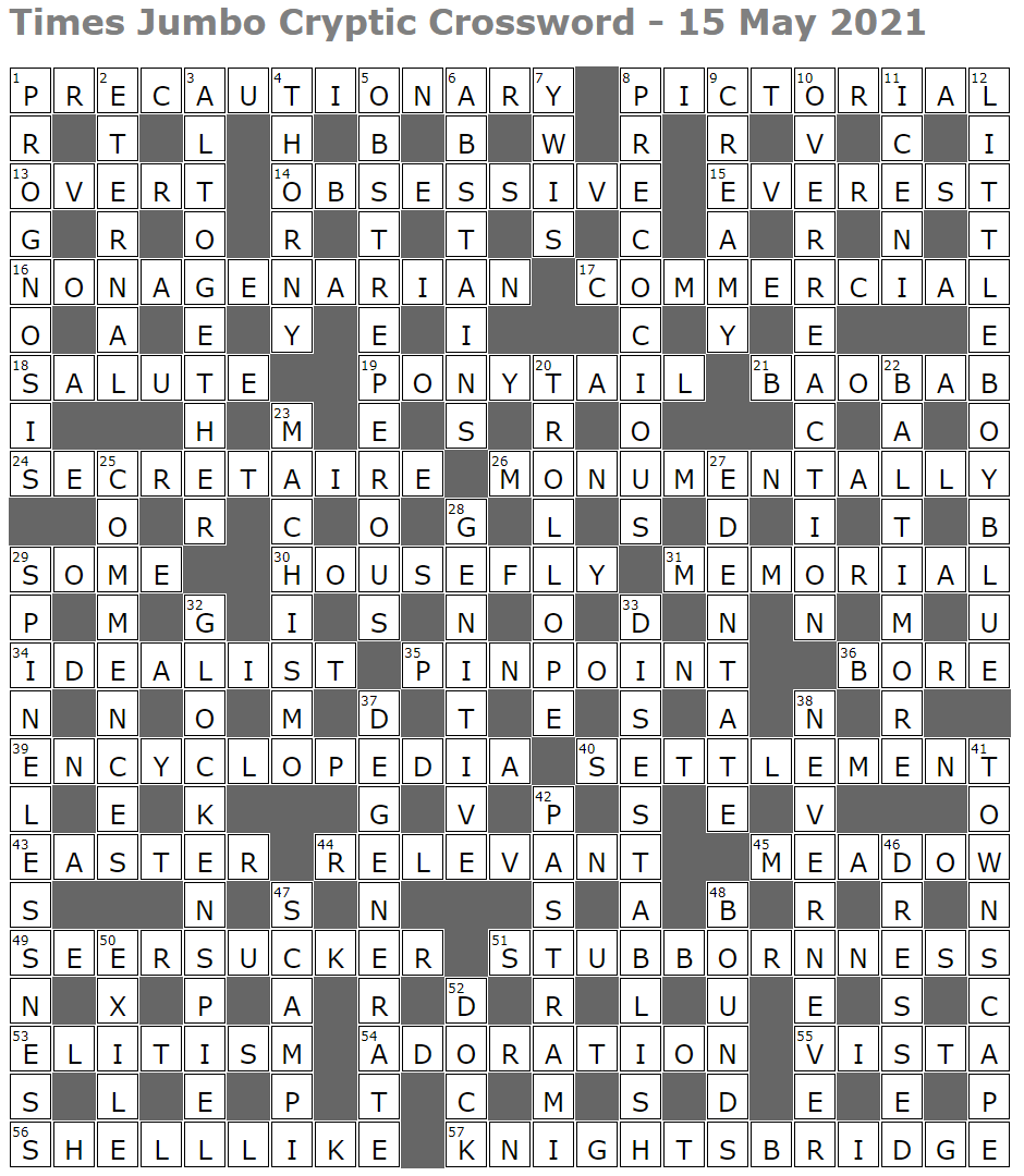 Anyway, you can find my completed grid below along with explanations of my solutions where I have them. I hope you find them helpful. Elsewhere, on my Just For Fun page, you can find links to solutions to the last 150-ish of these things should a recent Jumbo have you stumped. There are also the usual ancient book reviews and a story of mine.
