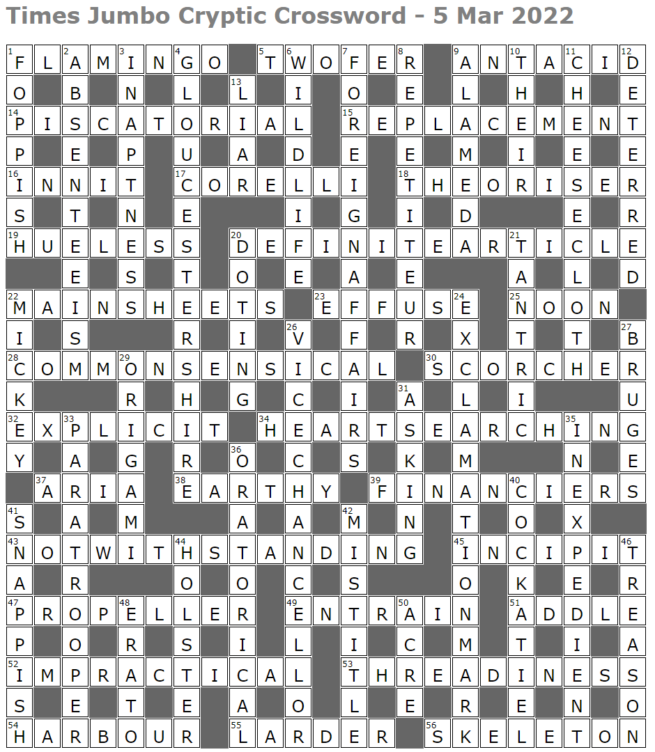A relatively straightforward Jumbo this week with some nicely worked clues and the kind of steady progression I like.