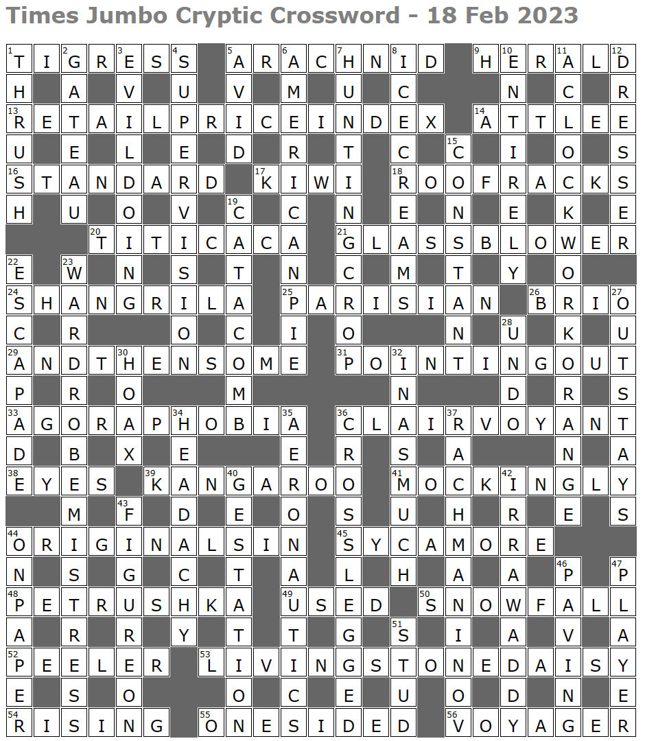 You can find my completed grid below along with explanations of my solutions where I have them. I hope you find them helpful. If a recent Jumbo has given you the slip then you might find my Just For Fun page of use, where you’ll find solutions to hundreds of the things. (250 of them if I’m not mistaken. Good grief, that’s a lot of Saturdays…)
