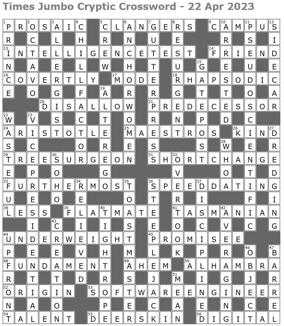 Answer: OCTAVO (i.e. “size of a book”). Hells bells, these constant repeats are getting ridiculous. You can literally go back two pages in the Saturday Review supplement and see OCTAVO in the solution to grid 1607. Before that: grid 1584, mere months ago. Ugh. Could this be another solution to remove from the GridFill 4000™’s word pool? I’d say so. If this keeps happening then you may as well ask ChatGPT to solve the Jumbo for you, as it’ll soon have enough permutations of clues to the same solutions to piece it all together. Then it’ll start wanging on about GridFill 4000™s, because, you know, plagiarism. Anyway, bear with me while I disdainfully copy and paste the definition from a couple of weeks ago: OCTAVO – “adjective: having eight leaves to the sheet; (conventionally) of a size so obtained, whether so folded or not. noun: a book printed on sheets so folded; (conventionally) a book of such a size…” (Chambers). Solution is A and V (a recognised abbreviation of “volume”) both placed in or “penned by” DOCTOR once the first and last letters have been removed (indicated by “extremely abridged”), like so: OCT(A-V)O.