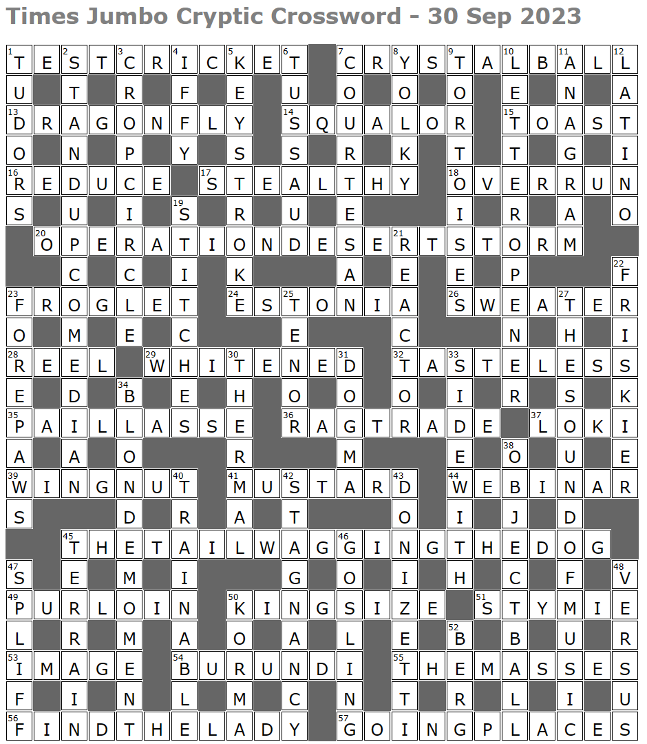 You can find my completed grid below along with explanations of my solutions where I have them. I hope you find them helpful. If a recent Jumbo has given you the bum’s rush then you might find my Just For Fun page of use, where you’ll find links to solutions for hundreds of the things.